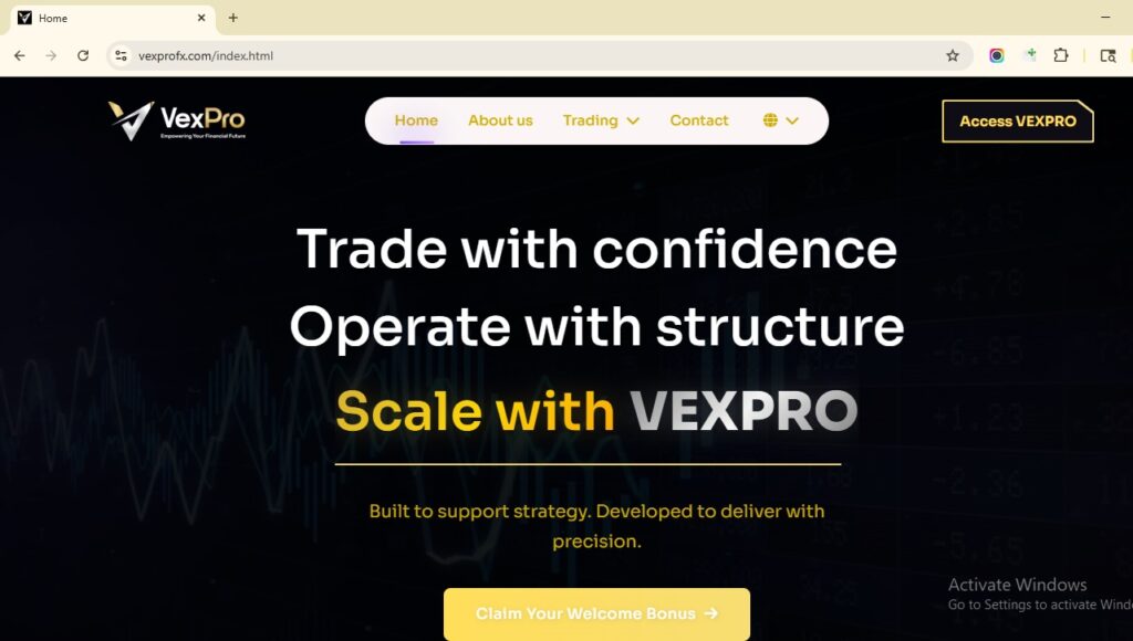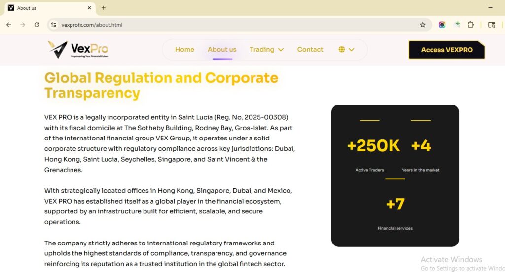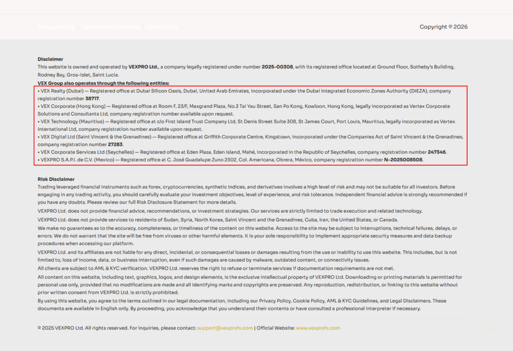 VexPro presents itself as a global forex and CFD broker, claiming offices in Dubai, Hong Kong, Singapore, and Mexico. It markets itself as part of the “Vex Group” with over 25,000 active traders across 160+ countries.